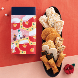 ●胡麻せんべい:うるち米(国産)、黒ごま、植物油脂、でん粉、食塩/調味料(アミノ酸等)、植物レシチン、(一部にごま・大豆を含む)