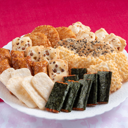 ●胡麻せんべい:うるち米(国産)、黒ごま、植物油脂、でん粉、食塩/調味料(アミノ酸等)、植物レシチン、(一部にごま・大豆を含む)