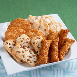 ●マカダミアナッツおかき:もち粉(もち米(国産))、植物油脂、マカダミアナッツ、水稲もち米(国産)、でん粉、食塩/調味料(アミノ酸等)、(一部にマカダミアナッツを含む)