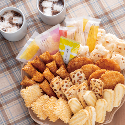 ●田舎おかき醤油味:水稲もち米(国産)、植物油脂、しょうゆ、砂糖、酵母エキス、でん粉/増粘剤(加工デンプン)、調味料(アミノ酸等)、乳化剤、(一部に小麦・大豆を含む)