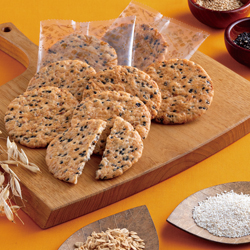 もち麦、オーツ麦、黒ごま、いりごまを練り込んだ、香ばしくプチザクとした堅焼き食感のおせんべい。