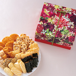 ●胡麻せんべい:うるち米(国産)、黒ごま、植物油脂、でん粉、食塩/調味料(アミノ酸等)、植物レシチン、(一部にごま・大豆を含む)