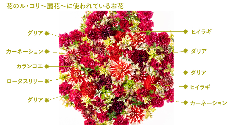 華やかな赤いダリアにヒイラギの緑が映えるモダンで