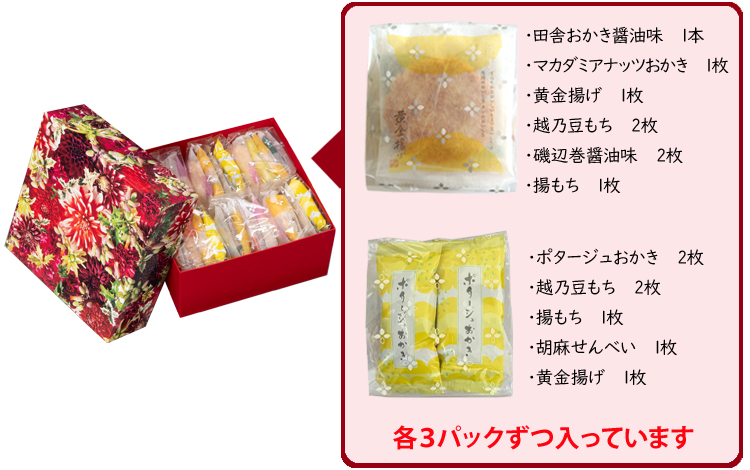 ●田舎おかき醤油味:水稲もち米(国産)、植物油脂、しょうゆ、砂糖、酵母エキス、でん粉/増粘剤(加工デンプン)、調味料(アミノ酸等)、乳化剤、(一部に小麦・大豆を含む)