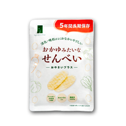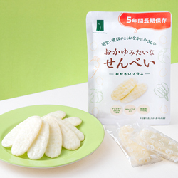 国産米100%の生地に国産にんじん・キャベツ・ほうれん草を練り込んだお野菜せんべい。消化・吸収が大変よく、お子様からお年寄りまで みなさまにお楽しみいただけます。さくっとひとくち食べると、すうっとお口の中で溶けてしまうまるでおかゆみたいなおせんべい。長期保存で災害時の備えにも!