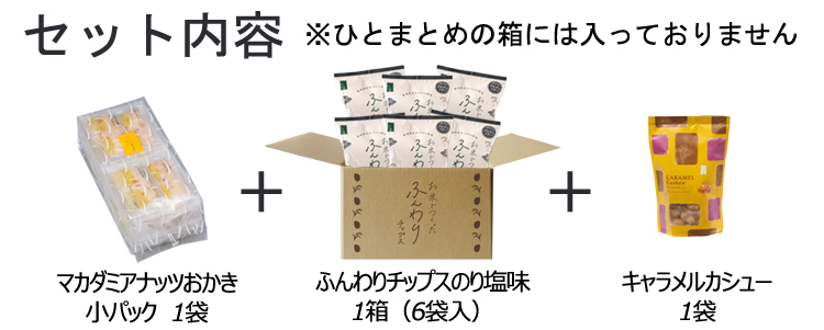 ご注意 ※3種セットの商品ですので数量欄に「1」とご入力いただくとマカダミアナッツおかき(小パック)1袋、ふんわりチップスのり塩味1箱、キャラメルカシュー1袋のお届けとなります。数量の入力間違いにはご注意ください。